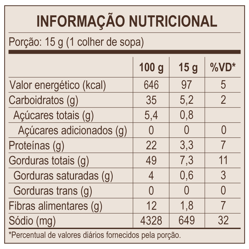 Armazenamento: Conservar em local seco, fresco e protegido da luz solar. Após aberto, mantenha em recipiente bem fechado. Pode ocorrer variação entre os lotes do produto, por se tratar de um alimento natural, o que não afeta a qualidade do mesmo.