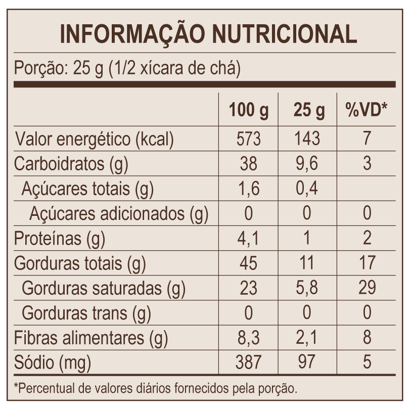 Armazenamento: Conservar em local seco, fresco e protegido da luz solar. Após aberto, mantenha em recipiente bem fechado. Pode ocorrer variação entre os lotes do produto, por se tratar de um alimento natural, o que não afeta a qualidade do mesmo.