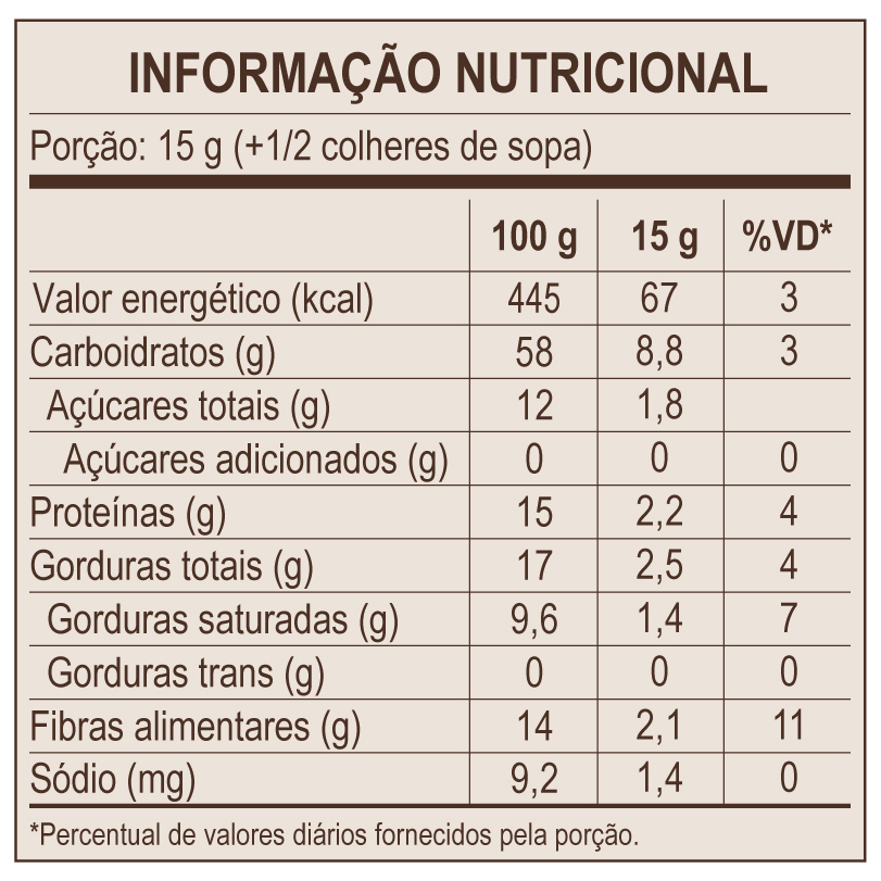 Alérgicos: CONTÉM GLÚTEN. Pode conter aveia, amendoim, avelãs, castanha de caju, castanha do Pará, centeio, cevada, leite, macadâmias, nozes, pecãs, pistache, soja e trigo.