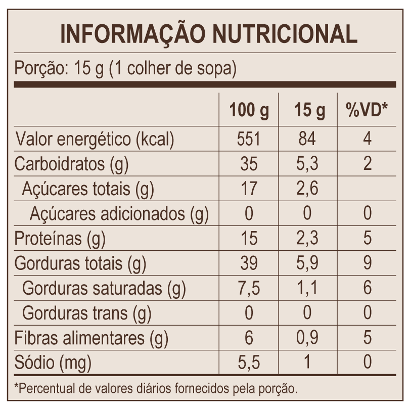 Armazenamento: Manter em local fresco, seco e arejado, protegido da luz solar. Após aberto, conservar em recipiente bem fechado. Pode ocorrer variação entre os lotes do produto, por se tratar de um alimento natural, o que não afeta a qualidade do mesmo.