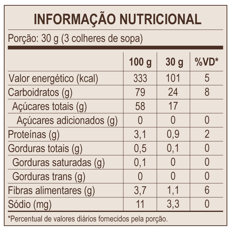 Armazenamento: Manter em local fresco, seco e arejado, protegido da luz solar. Após aberto, conservar em recipiente bem fechado. Pode ocorrer variação entre os lotes do produto, por se tratar de um alimento natural, o que não afeta a qualidade do mesmo.